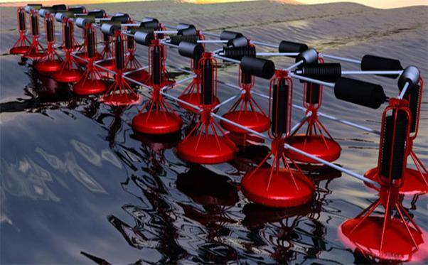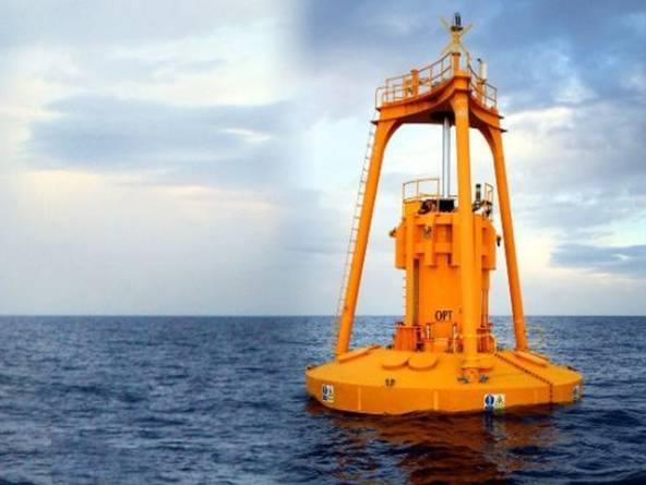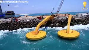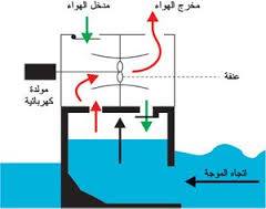ثانيا – تحويل حركة الامواج الجيبية إلى طاقة ميكانيكية أو كهربائية : تماما كحركة الذراع في الآلة البخارية . وذلك بجعل وعاء معدني ضخم عائم على سطح الماء يتحرك صعودا وهبوطا مع حركة الامواج , متصلا بدولاب أو عجلة أو مولد . كما نرى في الصورة .