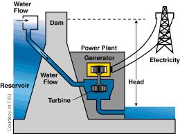 عند فتح المنفذ المائي في السد , تتدفق المياه بتأثير الجاذبية, وتتحول طاقة الدفق الكامنة إلى طاقة حركية . وذلك بتدوير عنفات المولد الكهربائي . ثم تنقل الطاقة الكهربائية المولدة إلى شبكة التغذية بتوتر ( فولت ) عال لتقليل الهدر الناجم عن مقاومة التيار الكهربائي في الأسلاك .