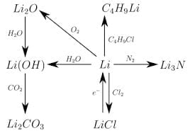 2 – إنّ لليثيوم خاصّيّة تميّزه عن باقي الفلزّات القلويّة وهي تفاعله مع النيتروجين الجزيئي ليشكّل نتريد الليثيوم ، وذلك حتّى في درجة حرارة الغرفة . Li + N2 → 2Li3N6