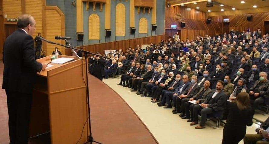 * صورة السيد لبيب الإخوان رئيس غرفة صناعة حمص يلقي كلمته بحفل تكريم الصناعيين القدامى في مدينة حمص بسورية . بتاريخ 06 / 03 / 2021 في المركز الثقافي بحمص .