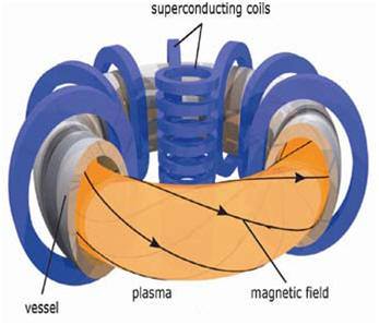 • التوكاماك ، حيث يحتجز خليط من نظائر الهيدروجين بواسطة حقل مغناطيسي بالغ الشدة.