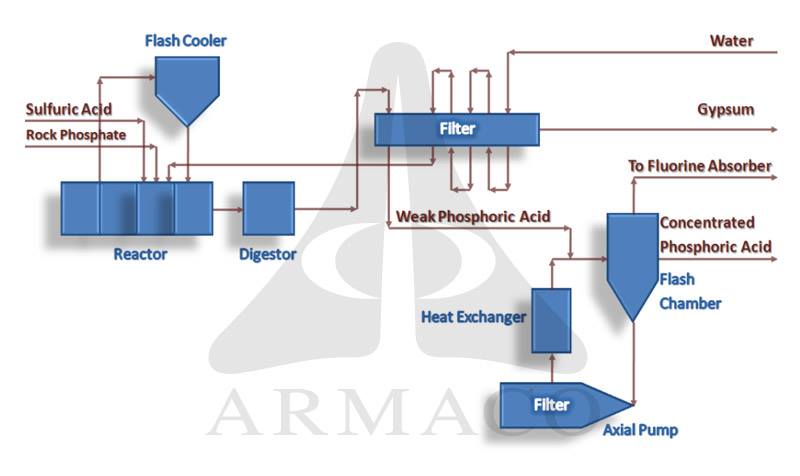 ينتج حمض الفوسفور بصورة عامة من تفاعل فلزات الفوسفات الخام وخاصة فلز الاباتيت Ore Apatite مع حمض الكبريت المركز , مع تشكل رواسب ضخمة من منتج ثانوي تدعى الفوسفوجبسوم Phospho gypsum ذات النشاط الإشعاعي لوجود اليورانيوم والثوريوم فيها , ولذلك كانت لا تستعمل بل تطمر رغم ما في ذلك من خطر على تلوث التربة والمياه الجوفية , وإن كان الآن لها استعمالات عديدة ربما نتكلم عنها فيما بعد :