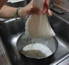 4 – بعد ذلك يتم ترشيحه في كيس من القماش الأبيض حيث ينتج من ذلك حليب الصويا ( كما في الصورة ) , يبقى في الكيس مادة عجينية غنية أيضا بالبروتينات غير الذوابة والمواد الغذائية التي تزداد قيمتها الغذائية بعد إضافة مادة : دي كلسيوم فوسفات إليها وتستعمل لتغذية الدواجن .